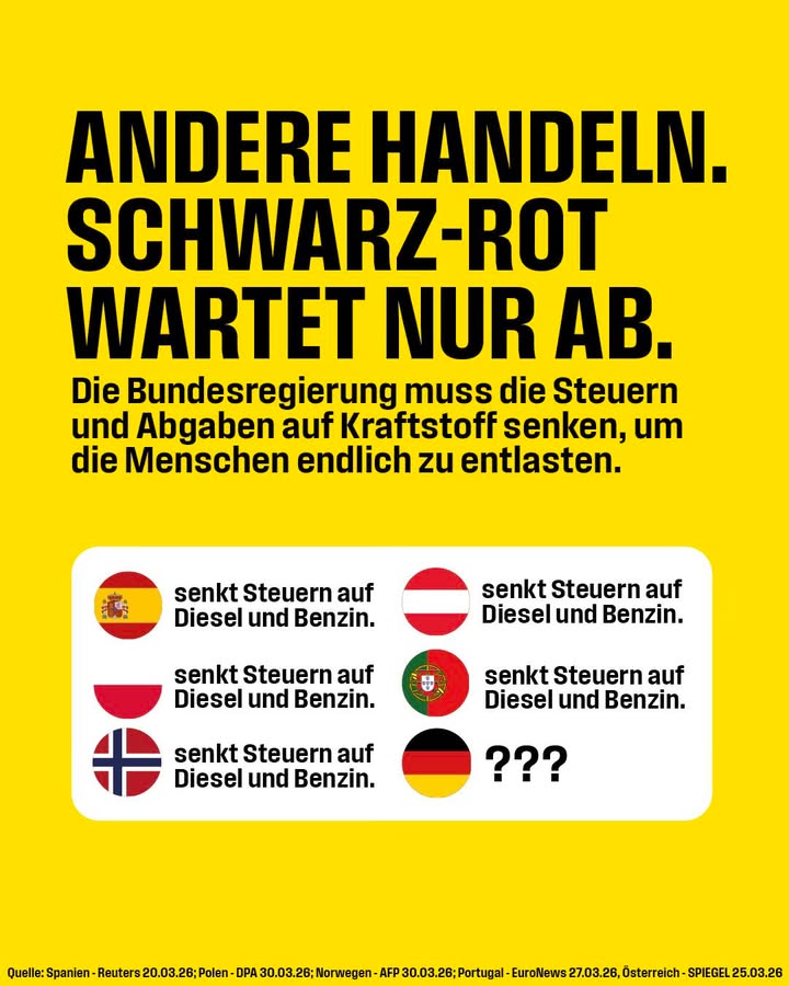 Während Länder wie Portugal, Spanien, Österreich, Polen und Norwegen die Menschen entlasten, indem sie die Steuern auf Diesel und Benzin senken, wird das "Kraftstoffmaßnahmenpaket" von Schwarz-Rot verpuffen – und Finanzminister Klingbeil verdient weiter bei jeder Tankfüllung mit.